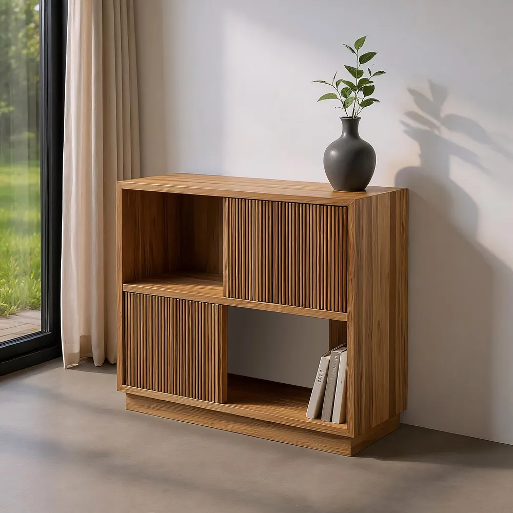 Naturaalse viimistlusega kapp on valmistatud taaskasutatud tiikpuidust, mis toob esile unikaalse tekstuuri ja värvitoonid.