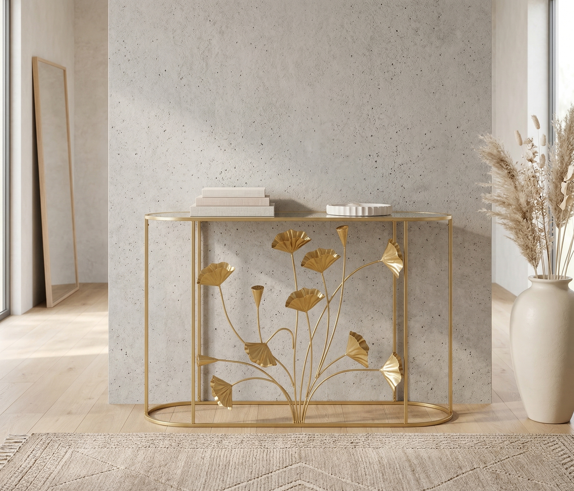 Konsoollaud Flow toob teie koju stiilsuse ja elegantsi. Konstruktsioon on kaunistatud lehtede ja lilledemotiividega, mis muudab laua selle mitte ainult silmapaistvaks, vaid ka äärmiselt funktsionaalseks mööbliesemeks. Olgu see siis esikus, elutoas või magamistoas, konsoollaud lisab igasse ruumi sära ja stiili.