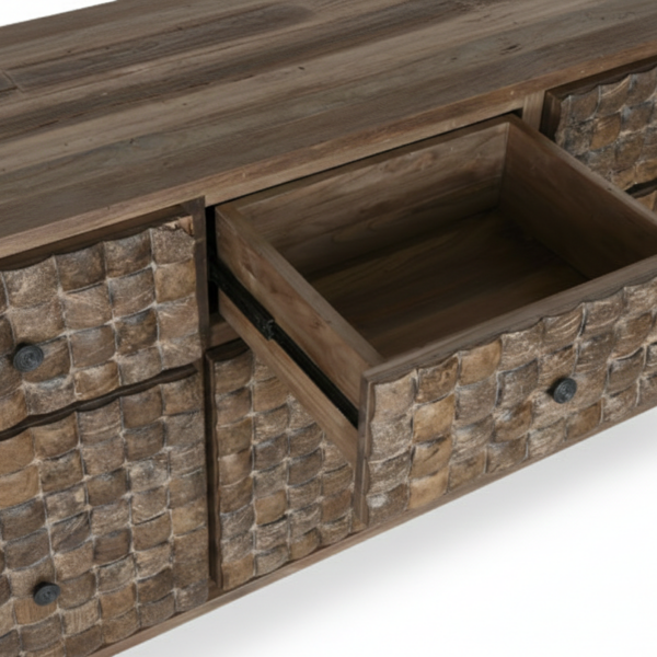 Kummuti valmistamisel kasutatud mangopuit on tuntud oma tiheduse ja vastupidavuse poolest. Mangopuit on ka keskkonnasõbralik valik, kuna see on taastuv ja jätkusuutlik. Kummuti pind on viimistletud väljaulatuvate detailidega ning pruuni tooniga, mis toob esile puidu loomuliku ilu ja tekstuuri, luues sooja ja kutsuva atmosfääri.