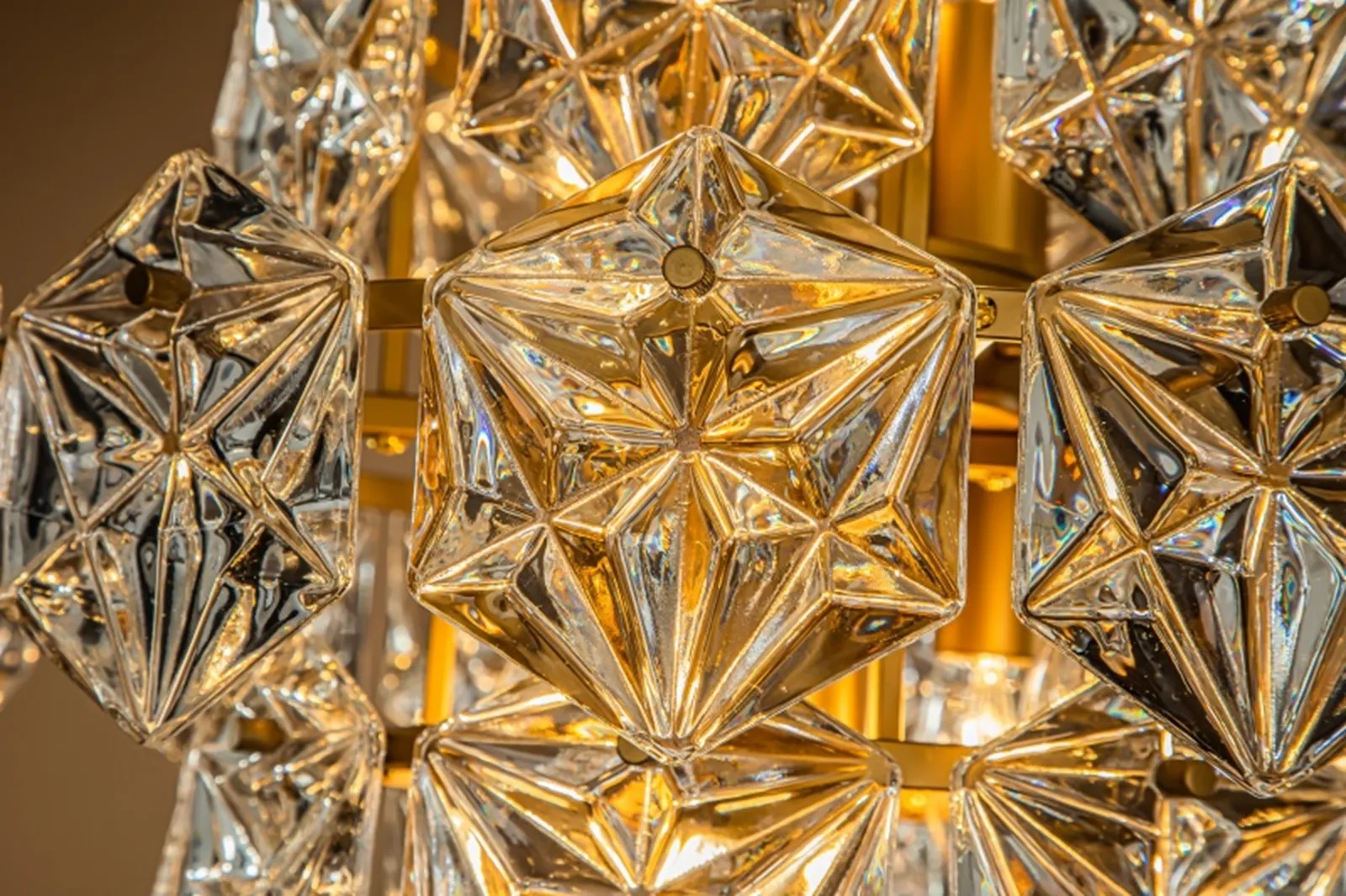 Lauavalgusti on valmistatud kvaliteetsetest materjalidest, mis tagavad nii esteetilise ilu, kui ka vastupidavuse. Klaasdetailid on hoolikalt valitud, et tagada nende selgus ja sära, peegeldades valgust kaunilt igas suunas. Struktuur on valmistatud tugevast metallist, mis on kaetud elegantse kuldse viimistlusega. Iga detail on hoolikalt viimistletud, et tagada luksuslik välimus ja kvaliteet.