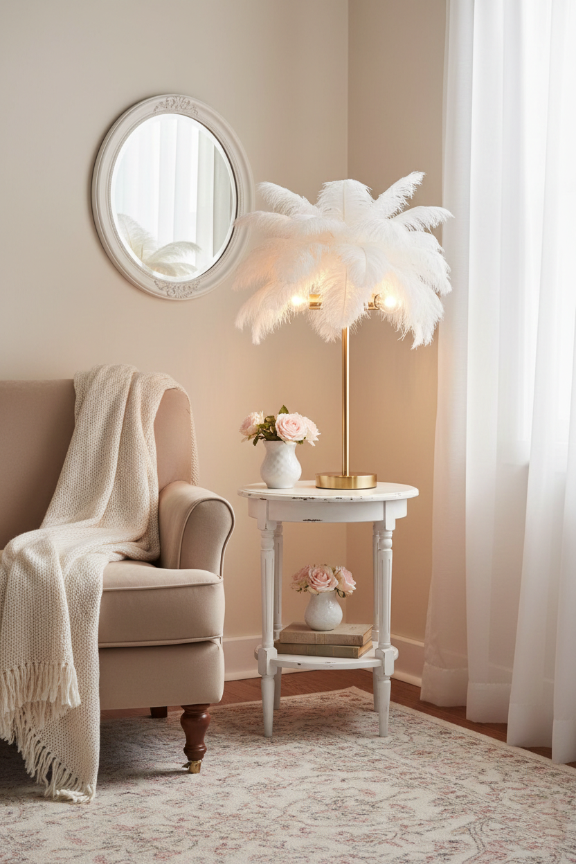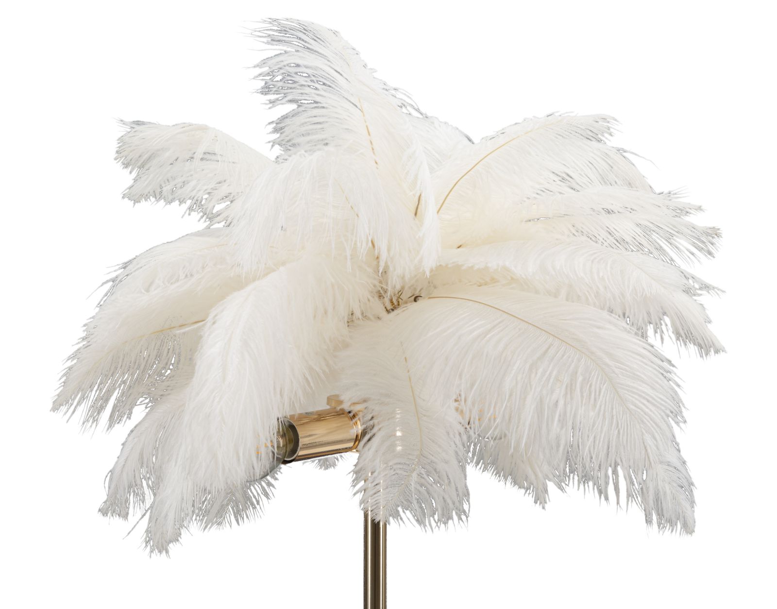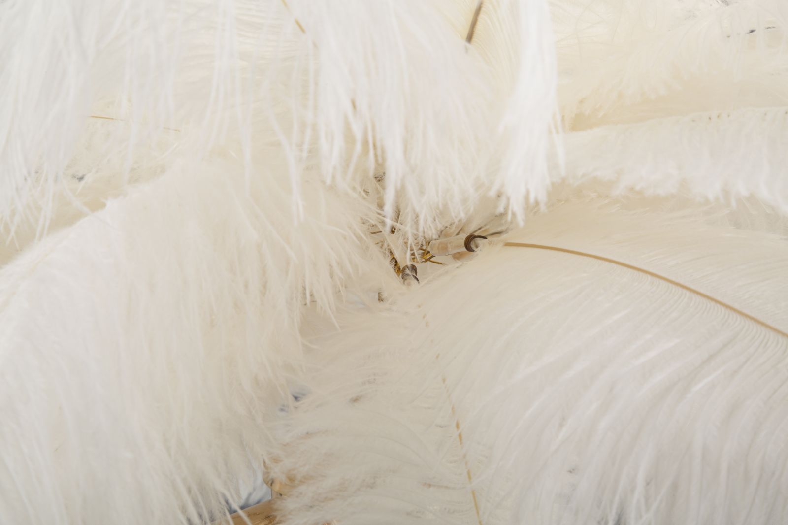 Lauavalgusti paistab silma oma elegantse ja silmatorkava disainiga. Valge sulgedest vari on pehme ja õhuline, luues sooja ja kutsuva valguse, mis peegeldub ruumis harmooniliselt. Sulgede kasutamine annab lambile unikaalse ja luksusliku ilme, mis tõmbab tähelepanu.