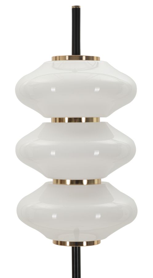 Valgusti kuppel on valmistatud kvaliteetsest valgest klaasist, mis mitte ainult ei taga pehmet ja meeldivat valgust, vaid lisab ka visuaalset huvi. Alus on valmistatud vastupidavast metallist, mille must viimistlus toob esile kuldsed elemendid, luues harmoonilise ja luksusliku välimuse.