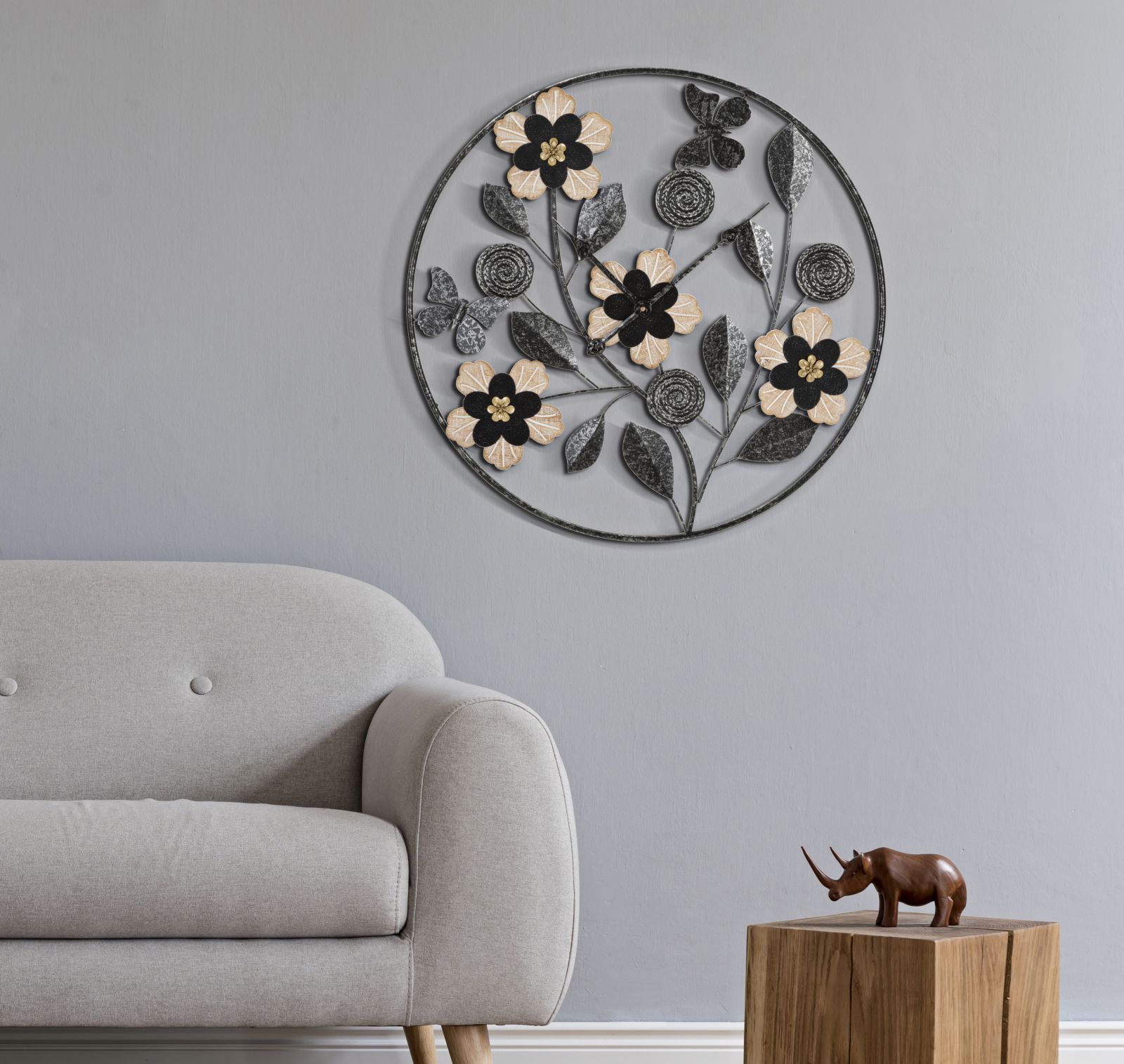 Kell on viimistletud musta ja naturaalse tooniga, mis loob ruumis pilkupüüdva elemedi. Kella sihverplaat on elegantselt kaunistatud lillede, lehtede ja liblikatega.