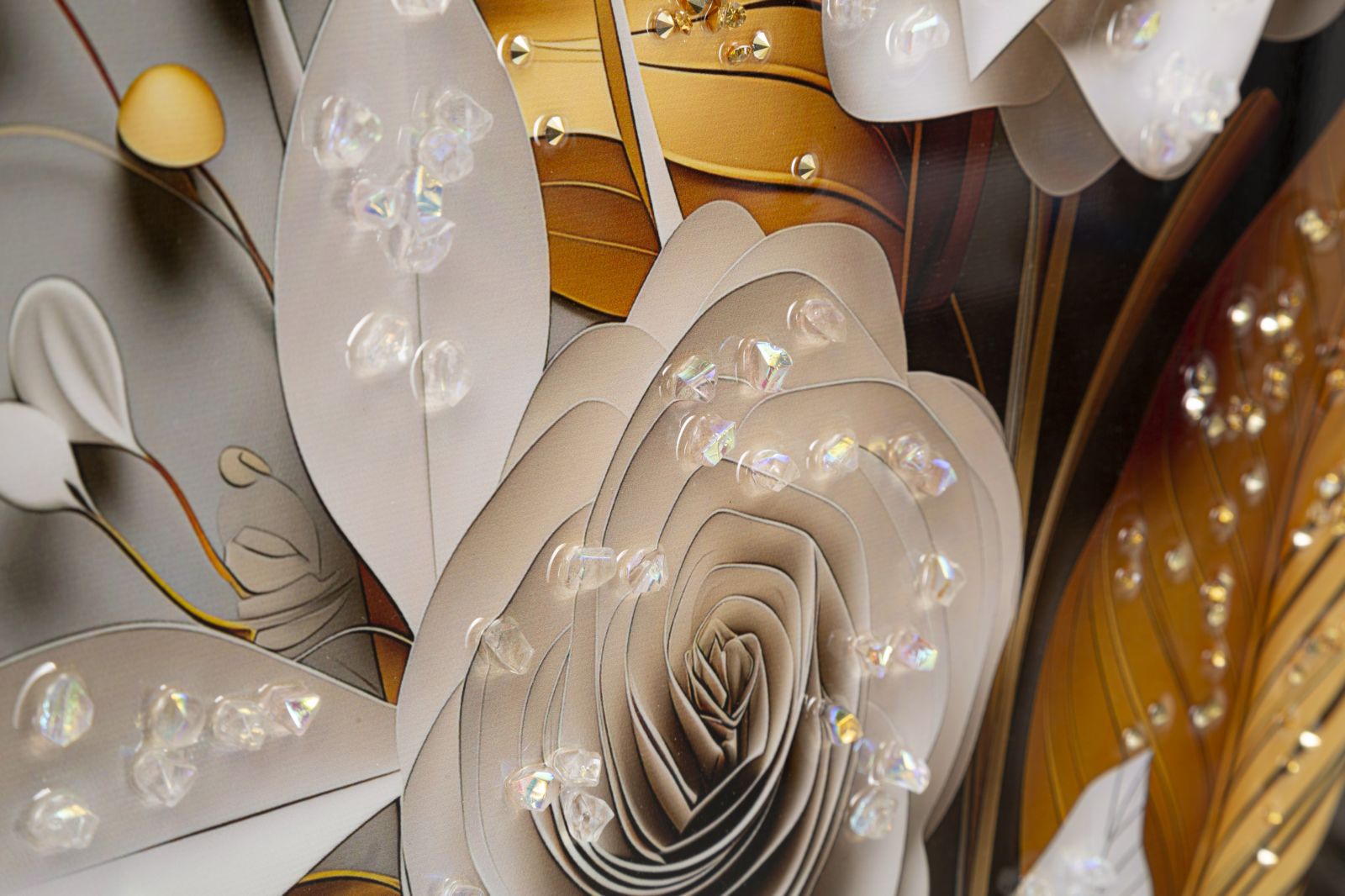 Teose eriliseks omaduseks on reljeefsed aplikatsioonid, mis lisavad sügavust ja tekstuuri. Need detailid muudavad seinapildi veelgi silmapaistvamaks ja unikaalsemaks, luues visuaalselt huvitava kogemuse.