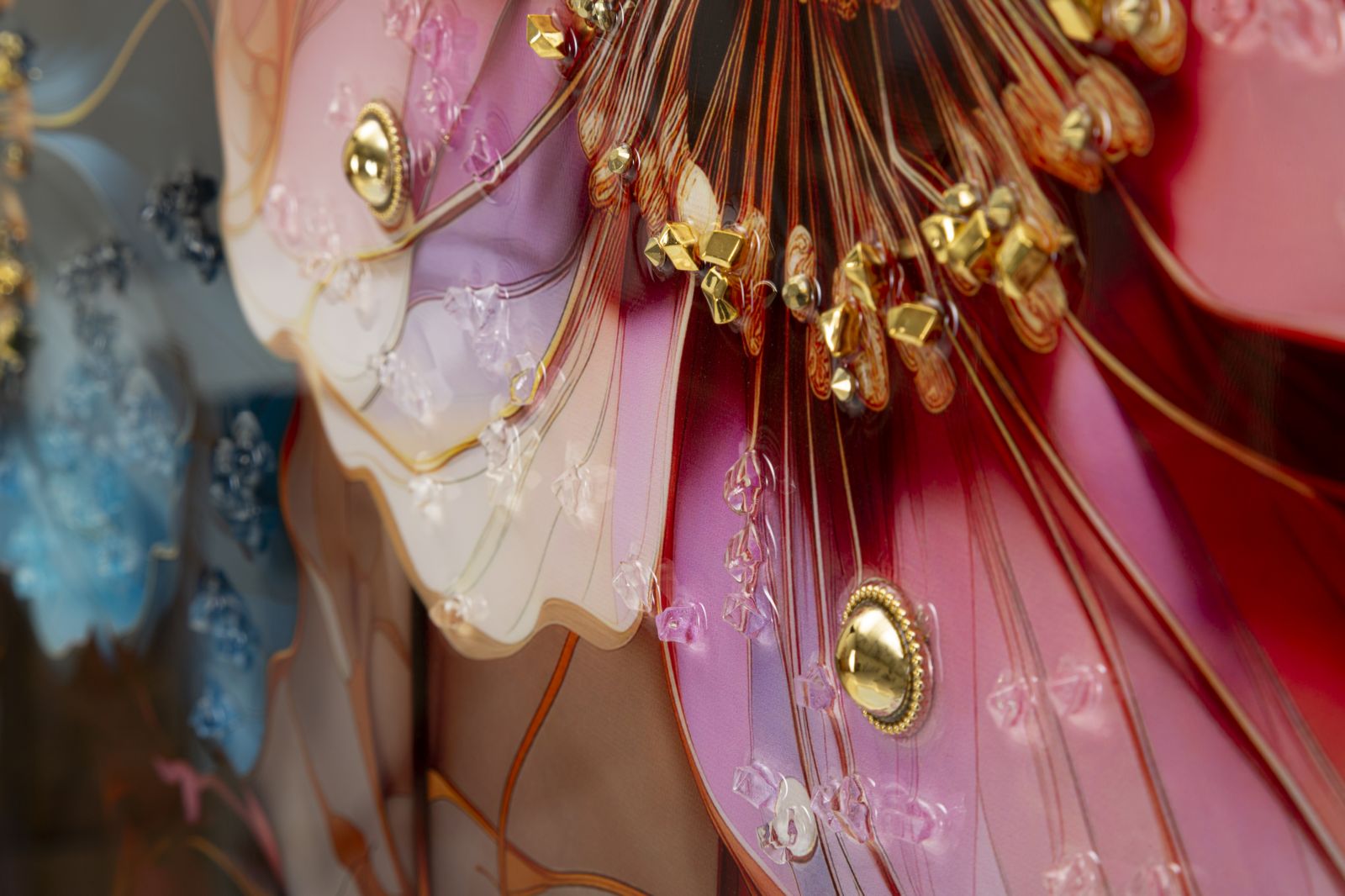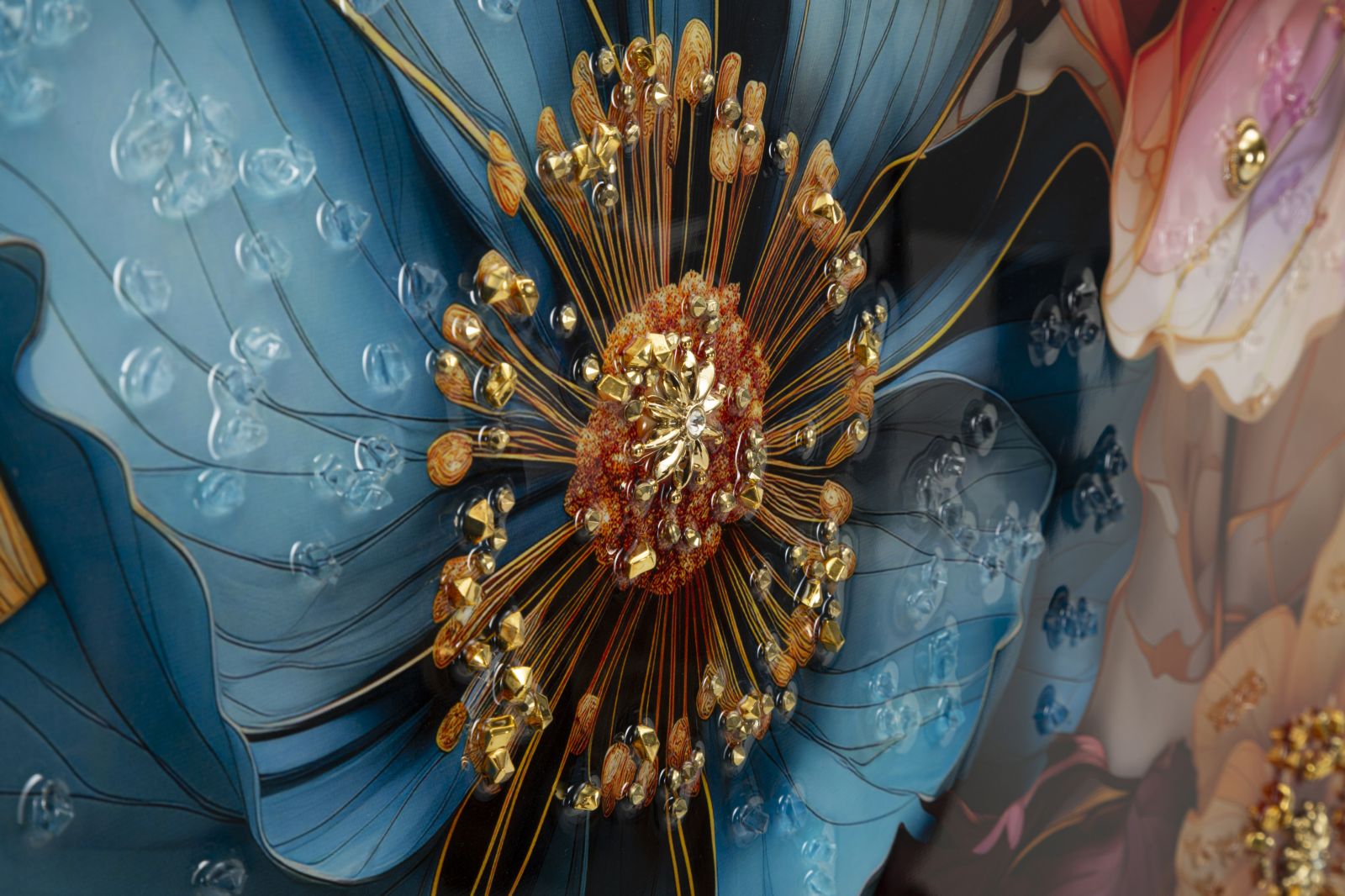Teose eriliseks omaduseks on reljeefsed aplikatsioonid, mis lisavad sügavust ja tekstuuri. Need detailid muudavad seinapildi veelgi silmapaistvamaks ja unikaalsemaks, luues visuaalselt huvitava kogemuse.