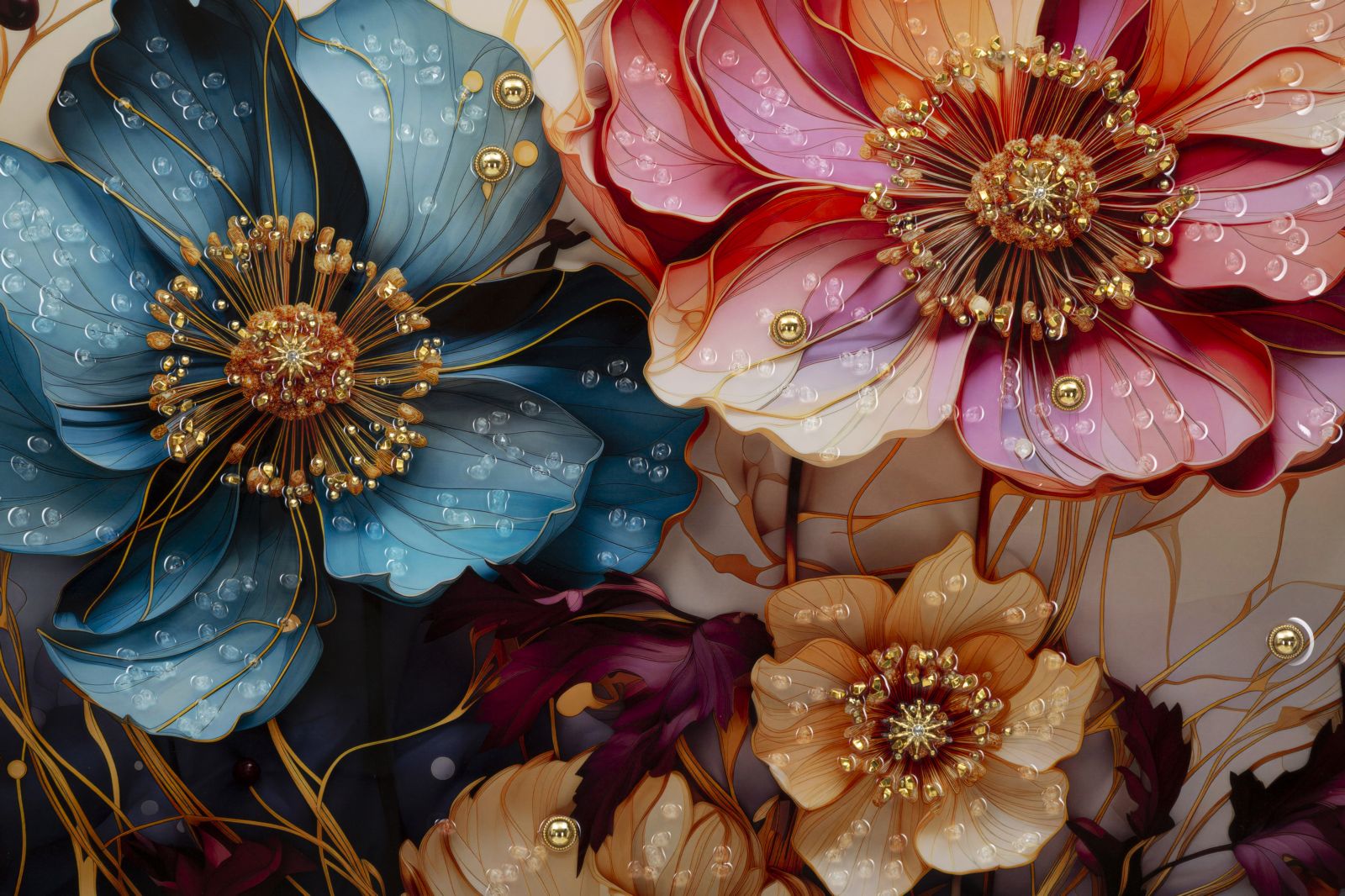 Pildil on kujutatud erksaid mitmevärvilisi lilli, mis toovad ruumi elu ja värskust. Lilled on hoolikalt ja detailselt maalitud, et rõhutada nende ilu ja mitmekesisust.