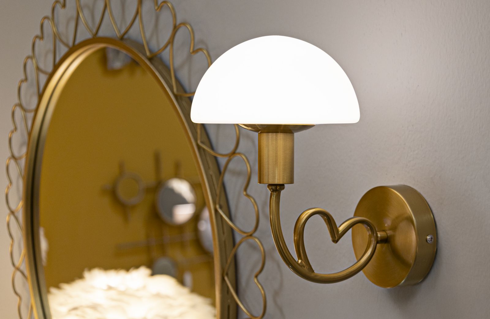 Valgusti eristub oma elegantse ja tähelepanu köitva disainiga. Mattvalgest klaasist valmistatud lambivari loob sooja ning kutsuva valguse, mis levib ruumis harmooniliselt. Valgusti raam on kuldse viimistlusega metallist ning stiilse südamekujulise disainiga.