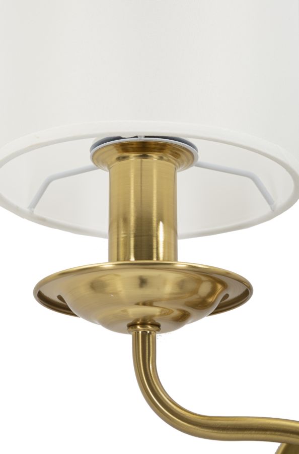 Valgusti valmistamisel on kasutatud kvaliteetseid materjale, mis tagavad mitte ainult esteetilise ilu, vaid ka vastupidavuse. Kangast valmistatud lambivarjud loovad sooja ja kutsuva valguse, luues hubase atmosfääri. Raam on valmistatud tugevast metallist, millel on elegantne kuldne viimistlus, mis lisab luksuslikku sära ja toob esile valgusti kvaliteedi.