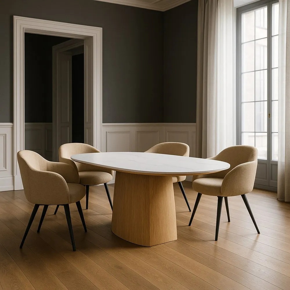 Söögilaud Ceramic on erakordselt silmapaistva disainiga, ühendades endas lihtsuse ja elegantsuse. Laua disain on tõeliselt pilkupüüdev, pakkudes midagi nii klassikalise kui ka moodsa stiili austajatele. Laua massiivne jalg annab sellele tugeva ja stabiilse aluse, samas kui valge lauaplaat toob ruumi kerguse ja avaruse tunde.