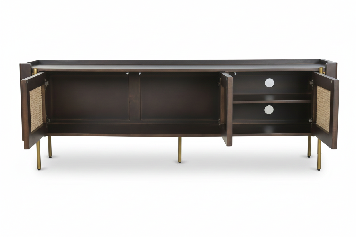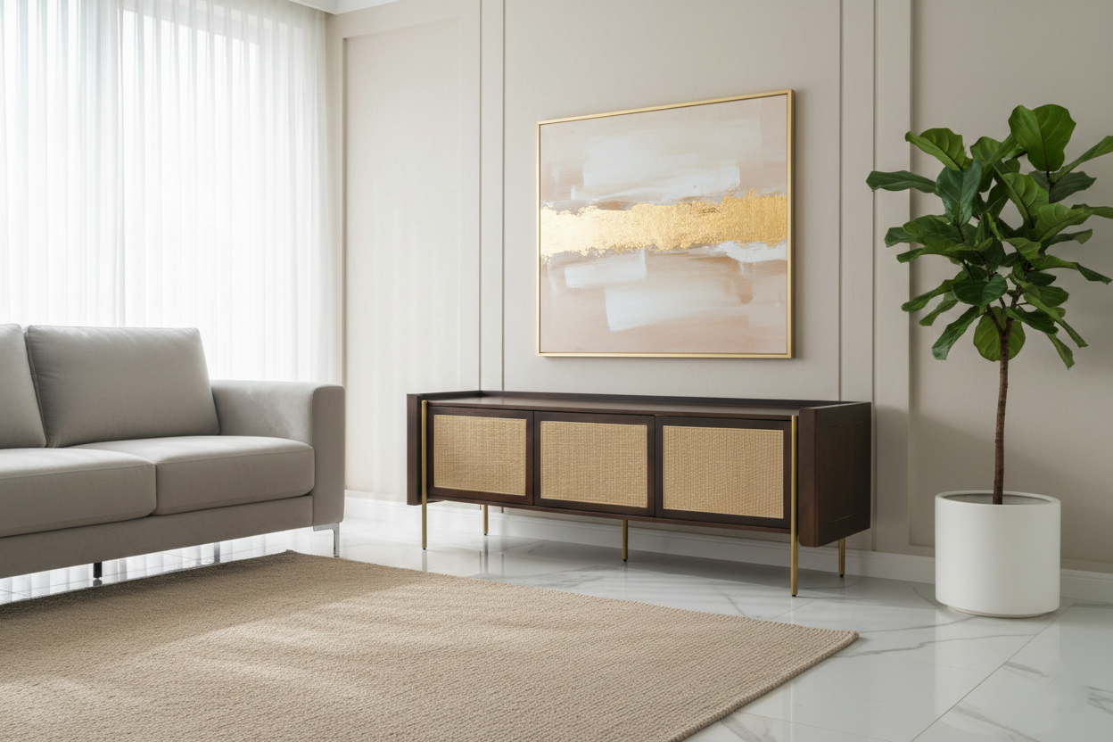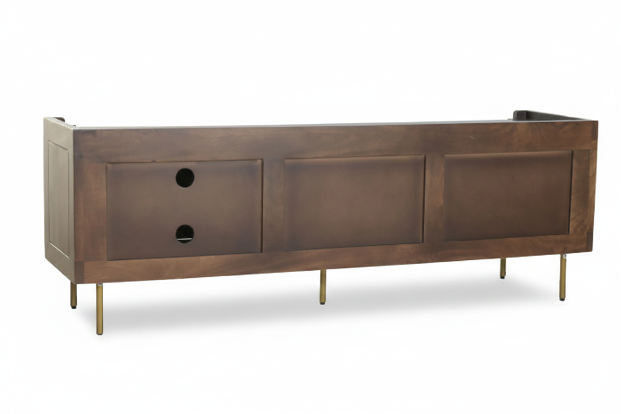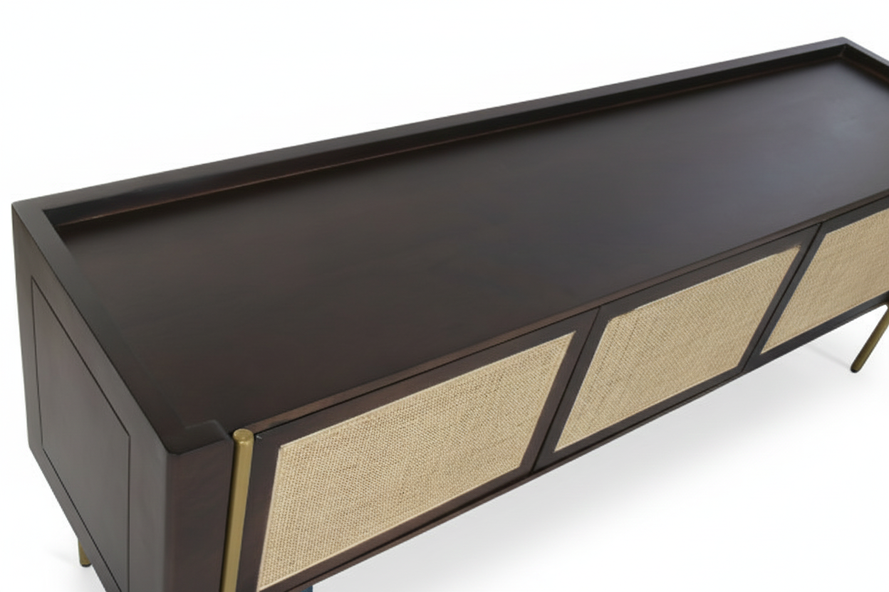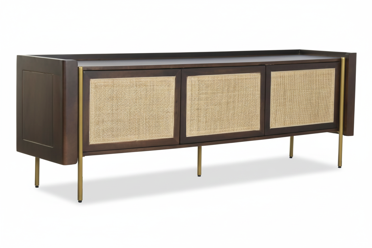 Mangopuidust ning naturaalsest kiust paneelidega kaunistatud tv-alus kiirgab elegantsi, pakkudes samas puidu soojust ja tekstuuri. See kombinatsioon loob harmoonilise tasakaalu, mis toob ruumi nii ilu kui ka funktsionaalsust.