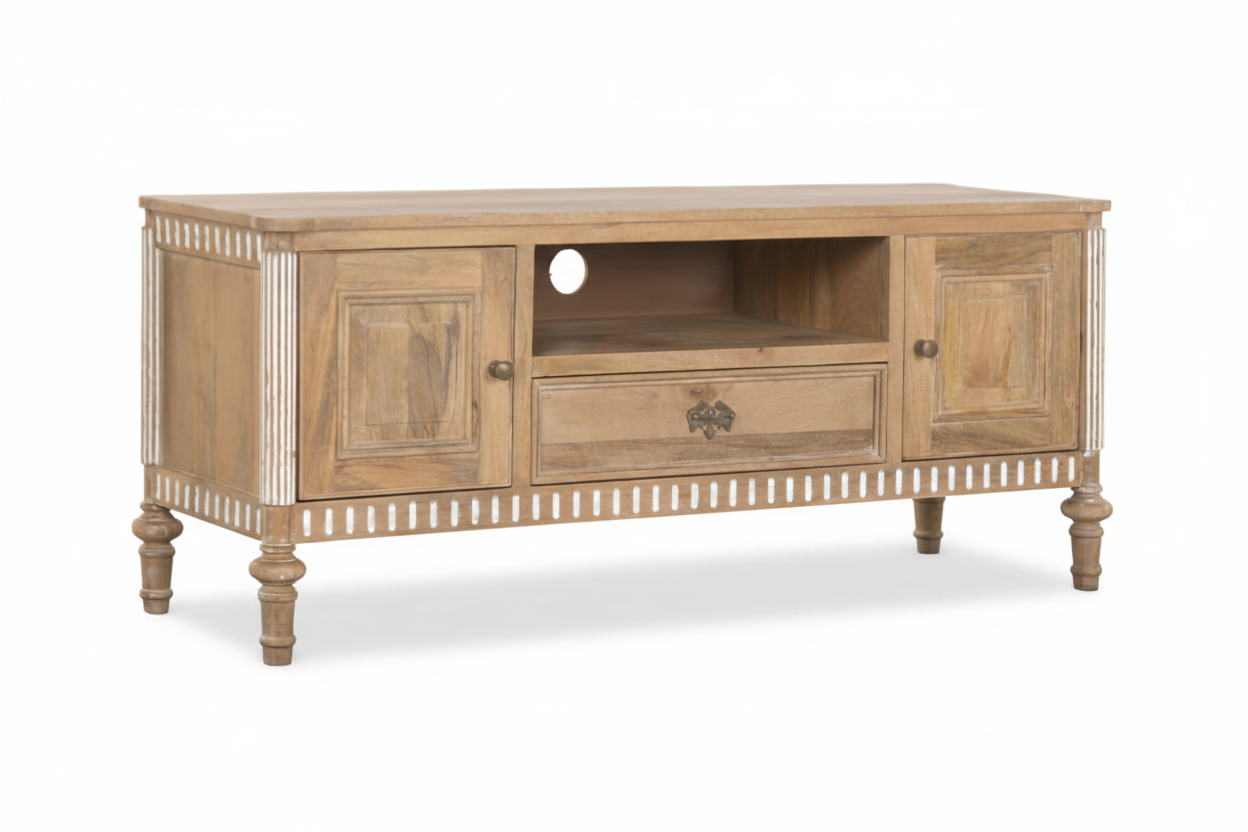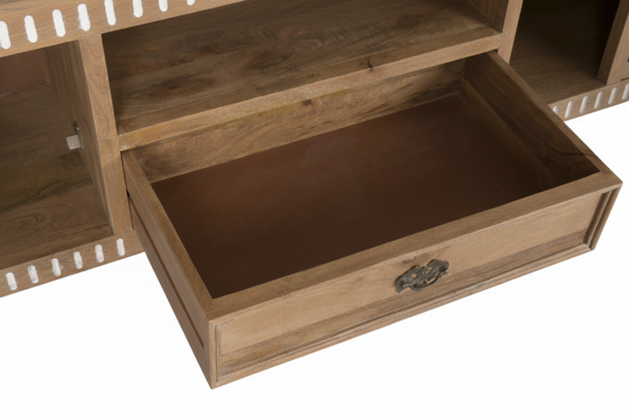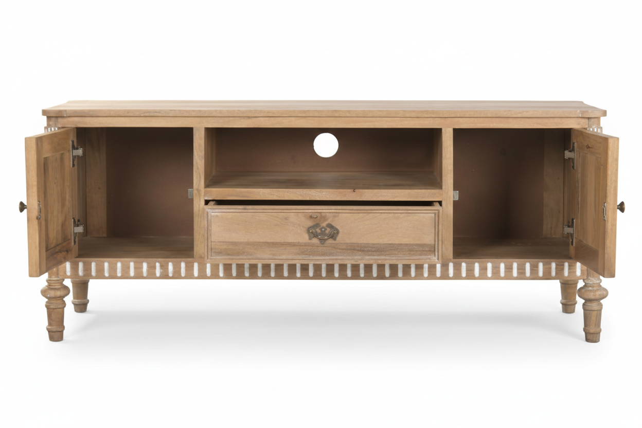 Tv-alus Castillo ühendab endas nii modernsust kui ka romantilist disaini, sobitudes sujuvalt igasse interjööri. Telerialus on valmistatud mangopuidust, mis on tuntud oma vastupidavuse ja pikaealisuse poolest. See tagab, et tv-alus pole mitte ainult visuaalselt kaunis, vaid ka praktiline investeering teie koju. Mangopuit on materjal, mis aja möödudes muutub kaunimaks, muutes kummuti aastate pärast veelgi iseloomulikumaks ja köitvamaks.