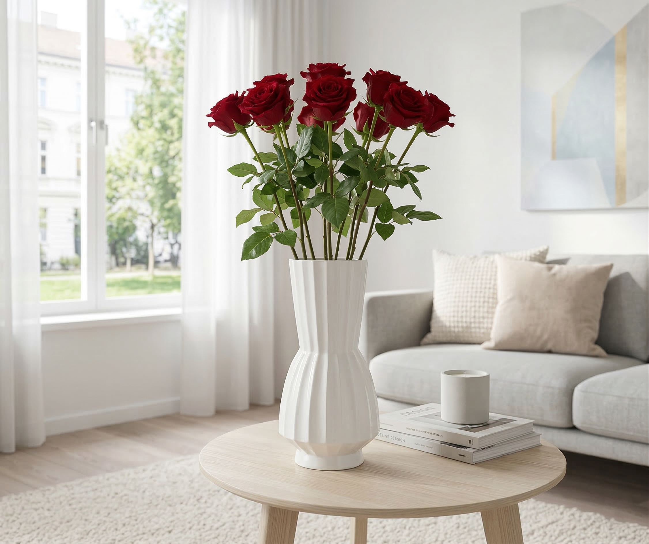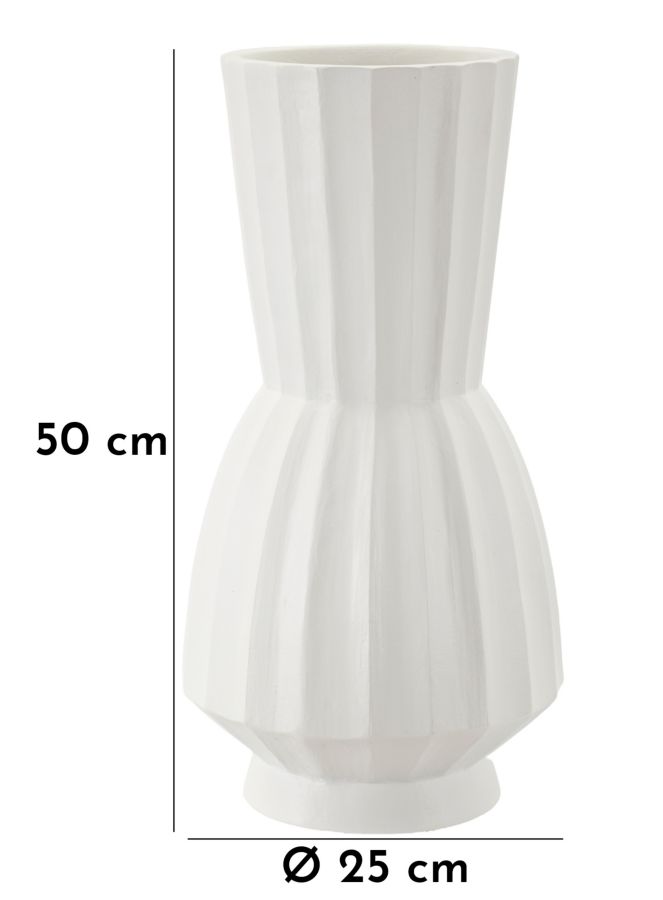 Vaas on valmistatud kvaliteetsest magneesiast, mis on tuntud oma vastupidavuse ja kerge kaalu poolest. Vaas on kaetud kauni valge tooniga, mis annab sellele puhta ja modernse ilme. Valge värvitoon on ajatu ja universaalne, võimaldades vaasil sulanduda erinevatesse sisekujundusstiilidesse, alates minimalistlikest ja skandinaavialikest lahendustest kuni klassikaliste ja eklektiliste interjöörideni.